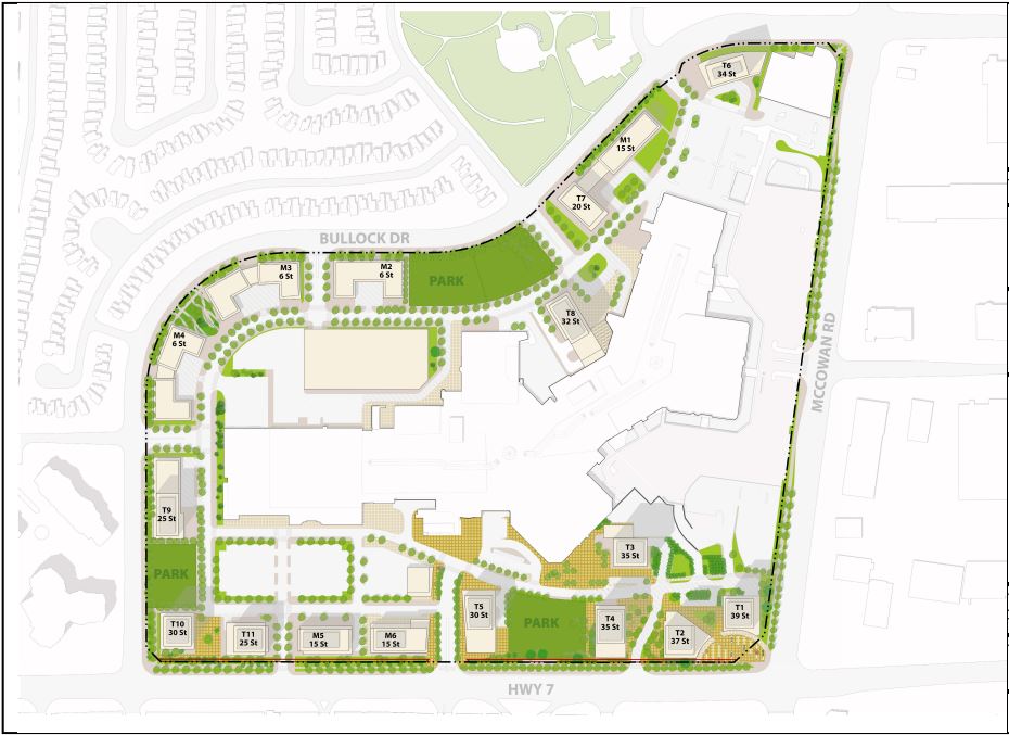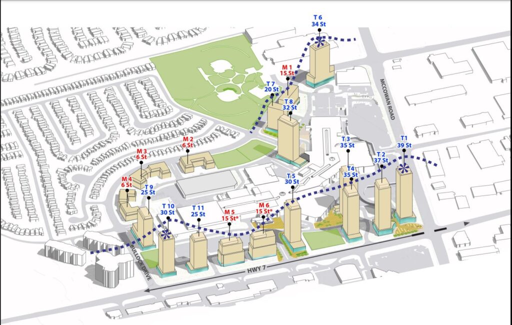 The updated Official Plan Amendment (OPA) for the CF Markville redevelopment will be presented at the Markham Development Services Committee (DSC) meeting on Monday, April 22 at 7:00 PM at the Markham Civic Centre Council Chamber (101 Town Centre Boulevard). While the maximum building height has been reduced slightly (from 45 to 39 storeys), the total number of residential units has increased to 4,500, raising serious concerns about overdevelopment, traffic congestion, school capacity, and insufficient community infrastructure.